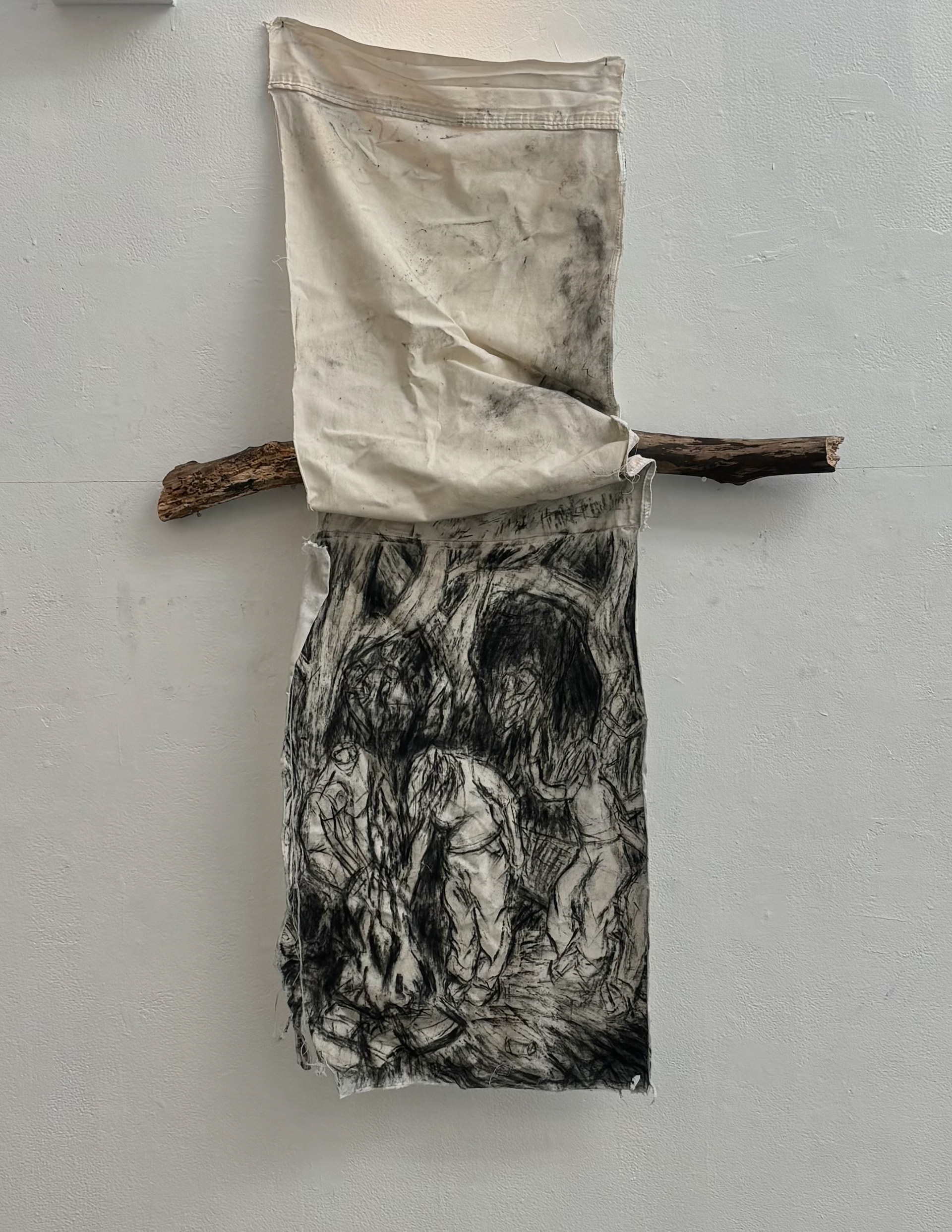 2024, found charcoal, beer, wood, and pillowcase, 55"x33"x3"