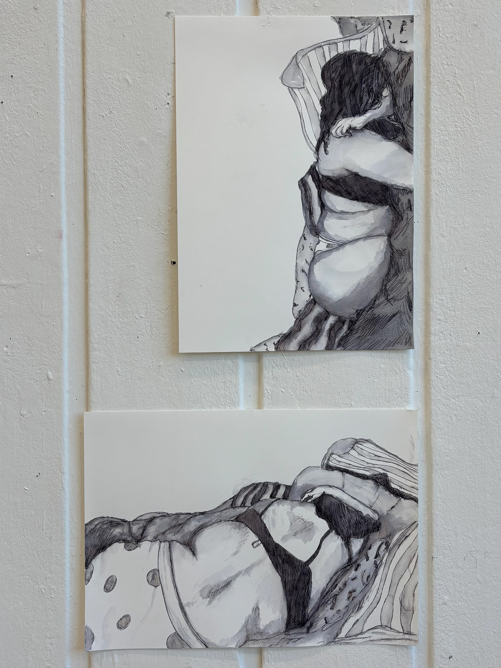 "between sheets" 2025, pen and water on watercolor paper, 11.7”x16.5”