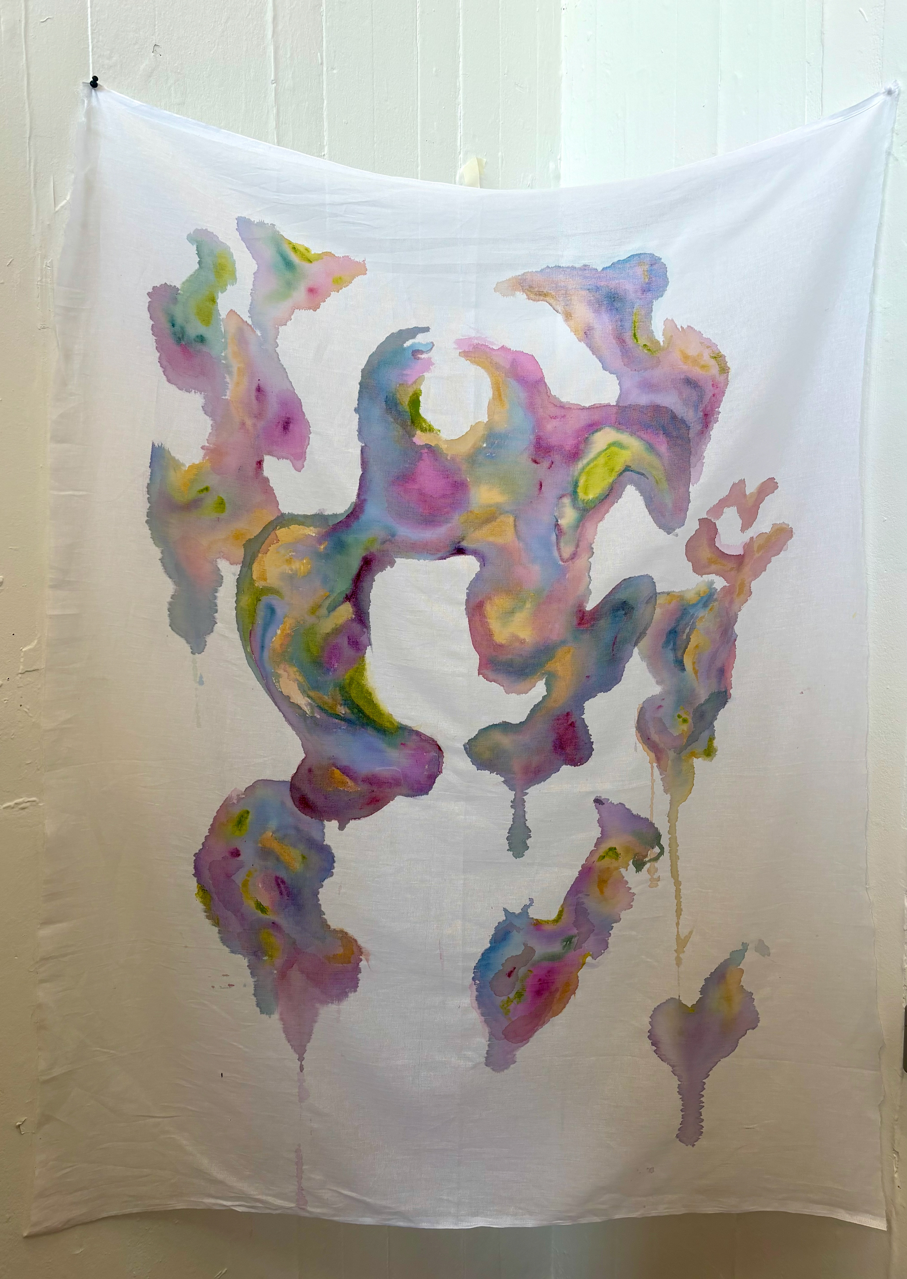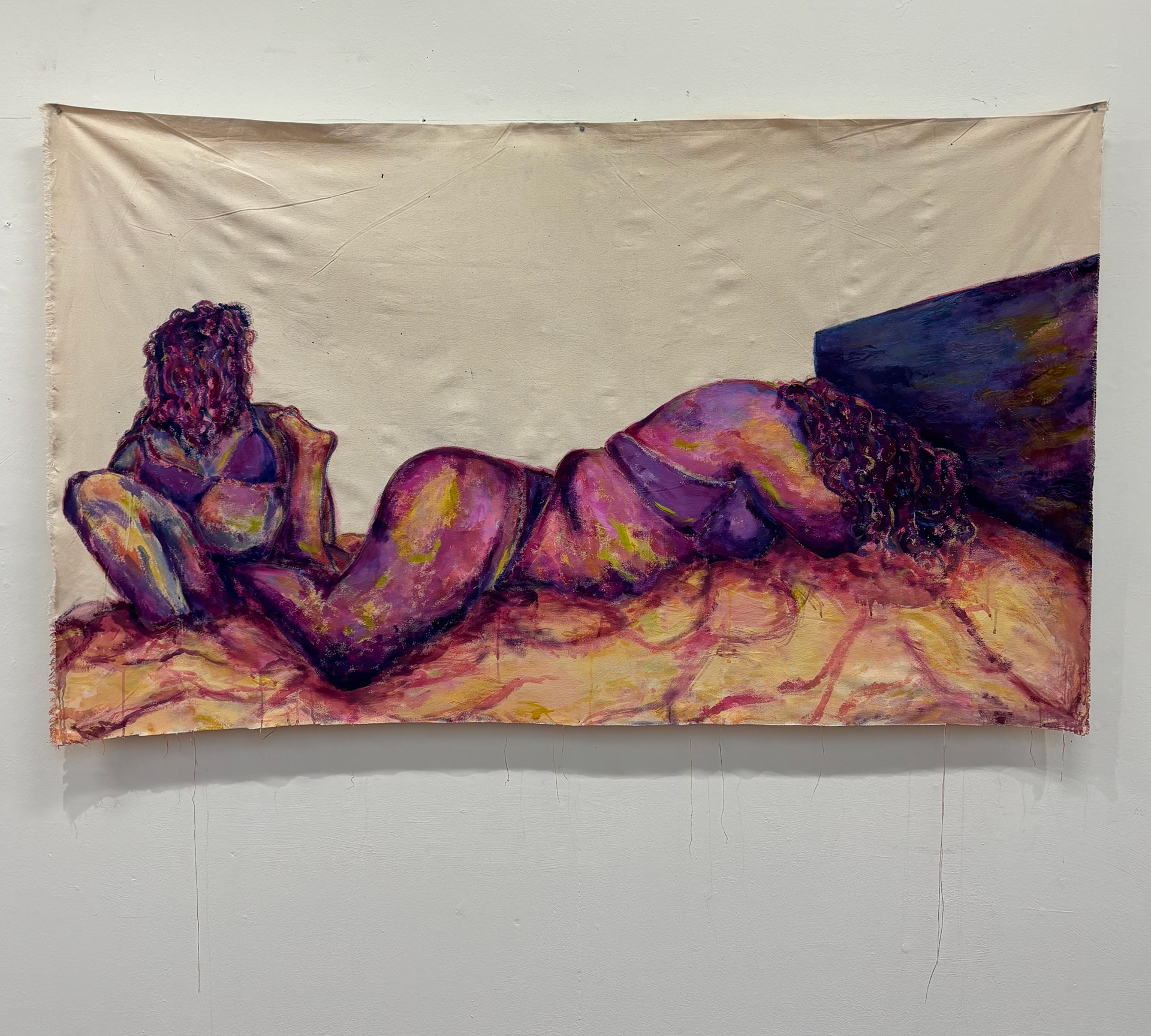 "it's in my stomach" 2025, acrylic paint and oil pastel on unstretched canvas, 3’4”x5’5”