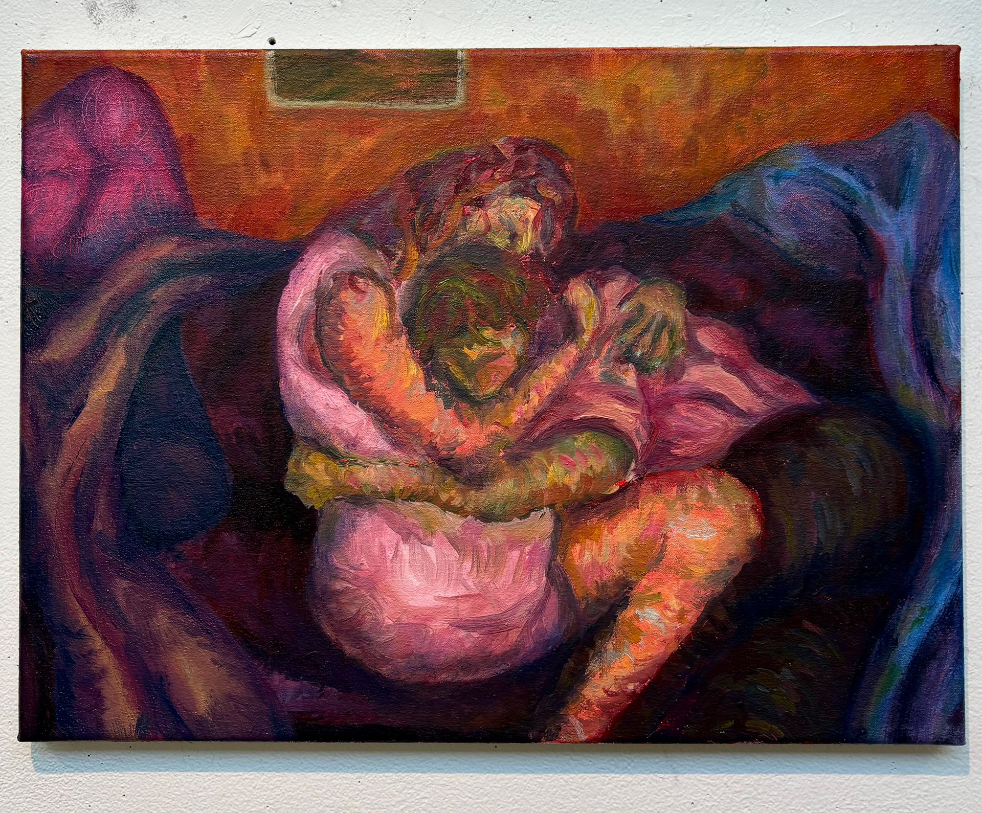 "in arms" 2024, oil on stretched canvas, 14"x19"